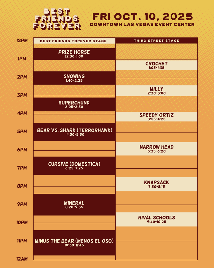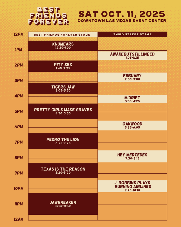 From the name to the visuals to, frankly, the lineup, it’s easy to label Best Friends Forever as a simple nostalgia fest. To be sure, that is a massive part of the appeal: Minus the Bear, Cursive, Bear vs. Shark, and Pedro the Lion all played anniversary shows; Jawbreaker, Penfold, Knapsack, These Arms Are Snakes, Hey Mercedes, Marietta, Pity Sex, Snowing, and Empire! Empire! (I Was a Lonely Estate) reunited specifically for this festival; Bear vs. Shark, Rilo Kiley, Texas Is the Reason, and Elliott performed at the festival as part of ongoing reunion tours; and Mineral’s set on Friday night was billed as their very last ever.